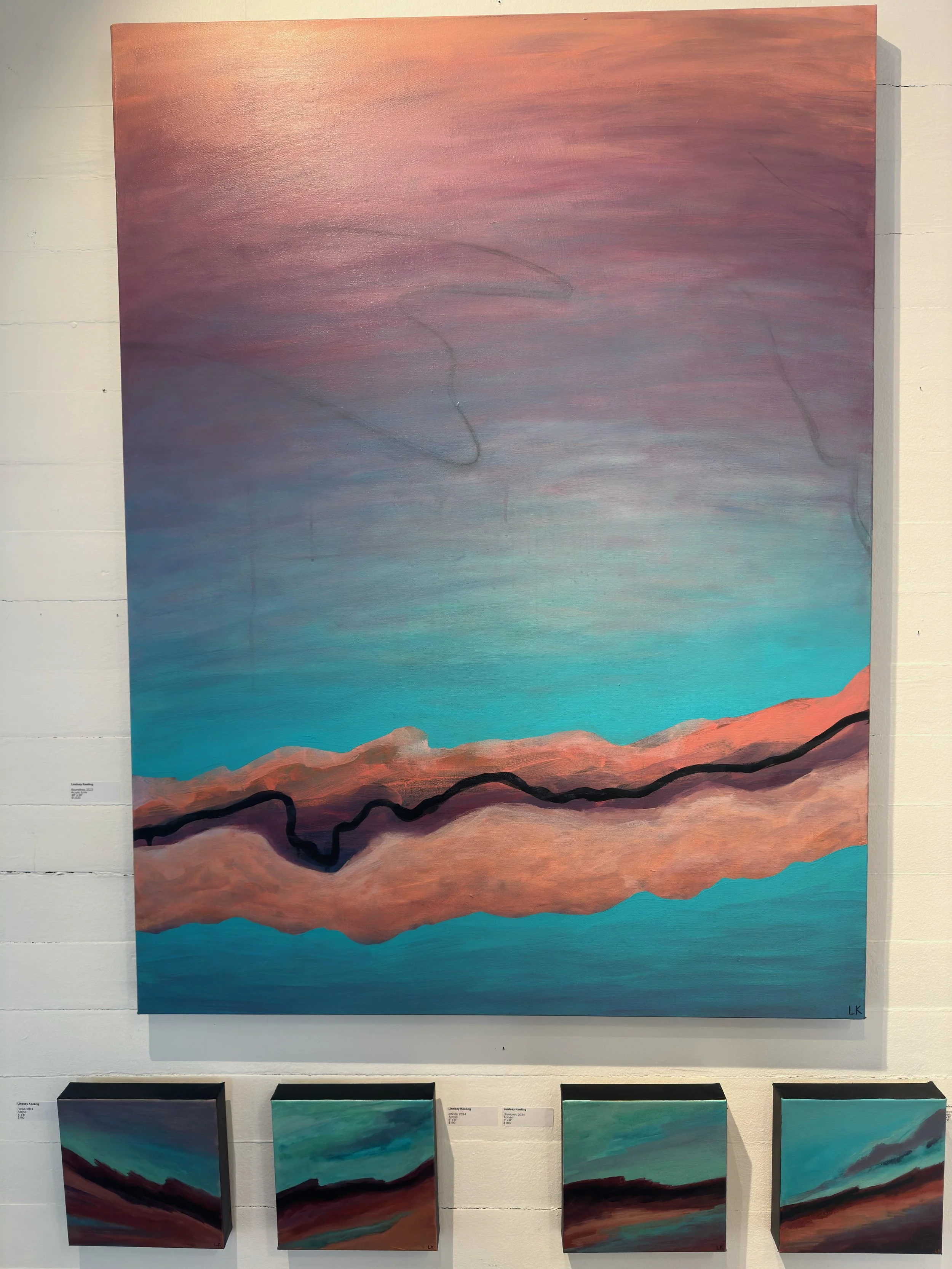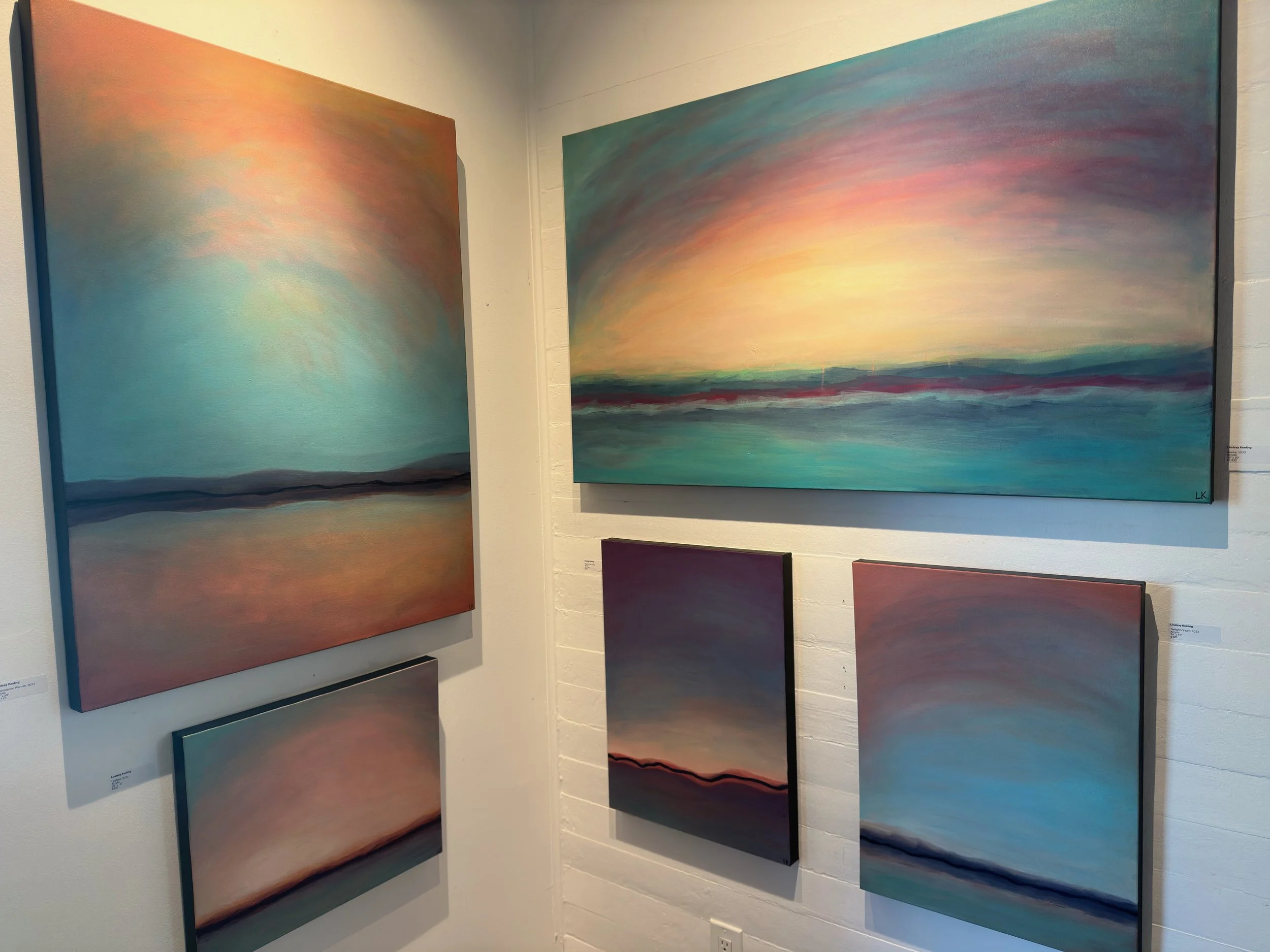 "Vibrant Serenity" was an abstract art exhibition by Lindsay Keeling. Her abstract landscapes captured the peaceful feeling of looking off into the distance, no matter the scenery. Lindsay plays with vibrant colors and contrasts to create a glow along the horizon. Visitors felt grounded and inspired when they looked at nature through her lens.